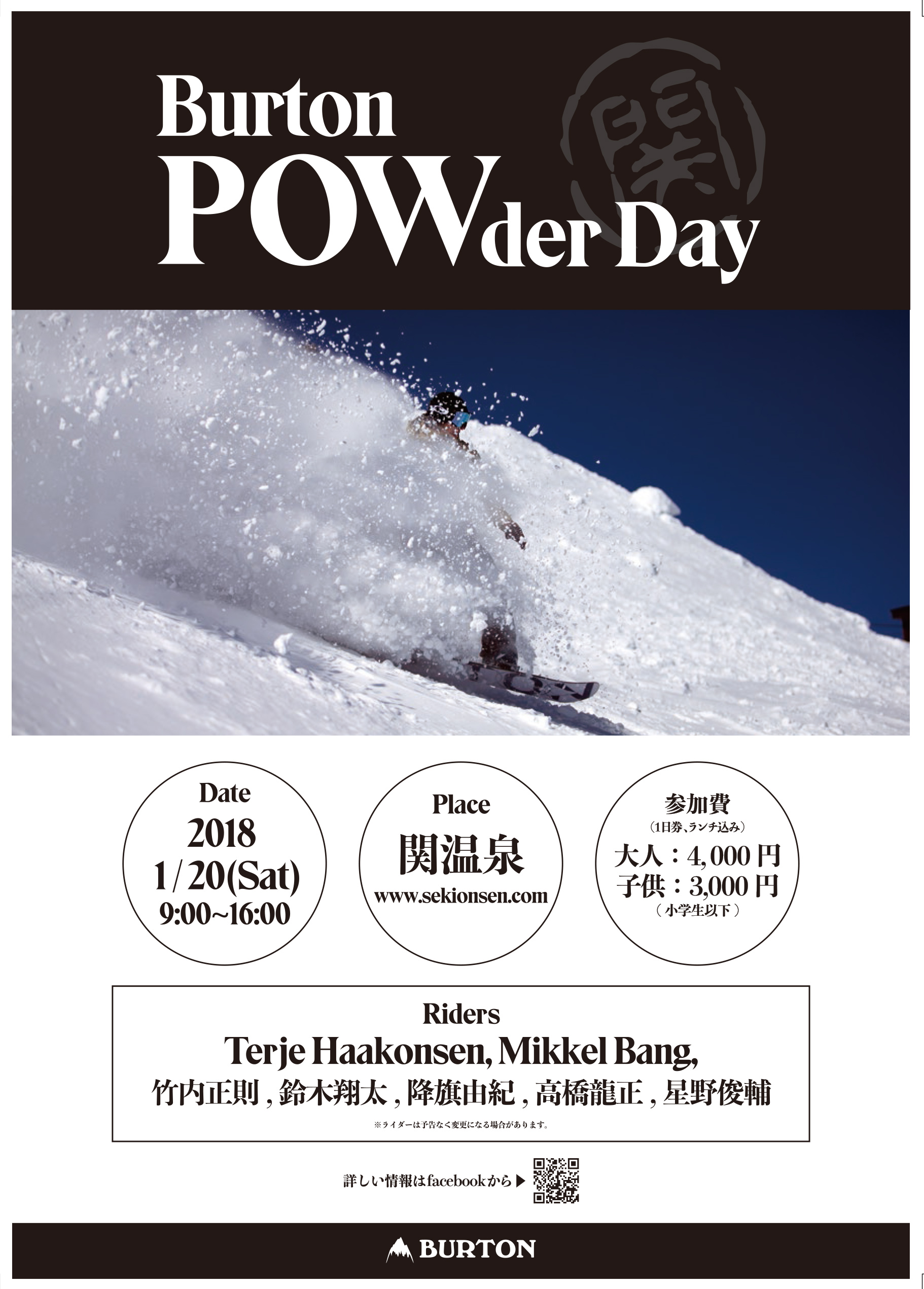 イベント名: Burton POWder Day 日時: 2018年1月20日(土) 9:00〜 場所: 関温泉 ライダー: Terje Haakonsen、M...