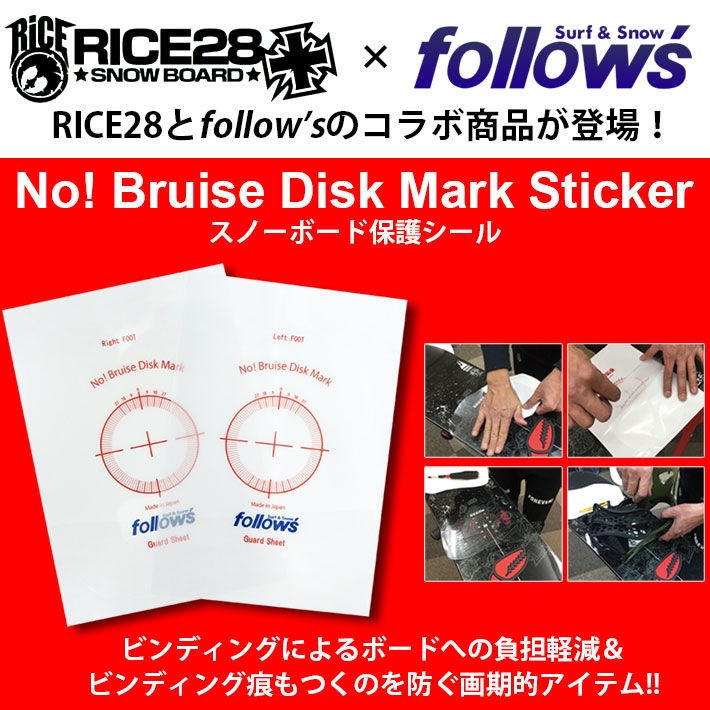 こんばんわ!! 今日はRICE28から発売され、今年フォローズコラボで販売している No Bruise Disk Mark!! このシートのものすごい効果をご紹介します!! 今季モデルのRICE28 DIVERSE 7です。 わかりますか?? このビンディング痕・・・ ディスクやベースプレートの傷がはっきりと残っています。 もしシートを貼っていなかったらと思うとぞっとします・・。 パッと見でこれだけ...