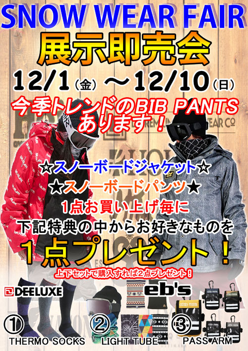 JUGEMテーマ:スノーボード 12月最初の土日 初滑りに行かれた方も多いのでは。 本日ご来店頂いたお客様もボード帰りの方が多かったです。 奥美濃ゲレンデはリフト待ちも長かったようです。 12月フォローズイベント第一弾は スノーボードウェア展示即売会 12月10日(日)まで イベント特典付き!! 超お徳チャンスです!! 選べる特典プレゼント!! しかも ジャケット、パンツSETでご購入の場合は 2点プレゼント!! &n...