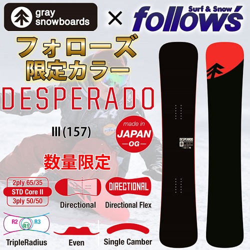 重大発表 GRAY SNOWBOARD グレイ スノーボード 看板モデルの DESPERADO (デスペラード) 157cmの?のみ 数量限定 フォローズ限定カラーが登場です!! 数量限定 早期ご予約受付中! 送料無料・代引き手数料無料 言わずと知れたテクニカルボード! grayスノーボード 2017-2018 17-18 GRAY SNOWBOARD グレイ スノーボード DESPERADO フォローズ限定カラー デスペラード ハンマーヘッド カービング デッキがGREYカラーの通常モデル フォローズ...