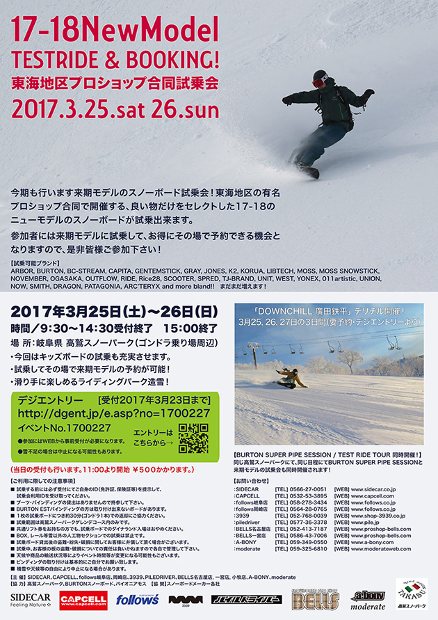 JUGEMテーマ:スノーボード 今年もやりますよー ! ! 17-18 NEW MODEL 東海エリアプロショップ合同試乗会&早期予約会 3月25日(土)、3月26日(日) 高鷲スノーパークにて 試乗してお気に入りのボードが見つかったらその場で予約しよー! 現地followsテントにてスノーボードの予約受付てます! たくさんの参加お待ちしてまーす! ・「DOWNCHILL 廣田鉄平」 デリチル開催! 3月25, 26, 27日開催! ・ 今回はキッ...