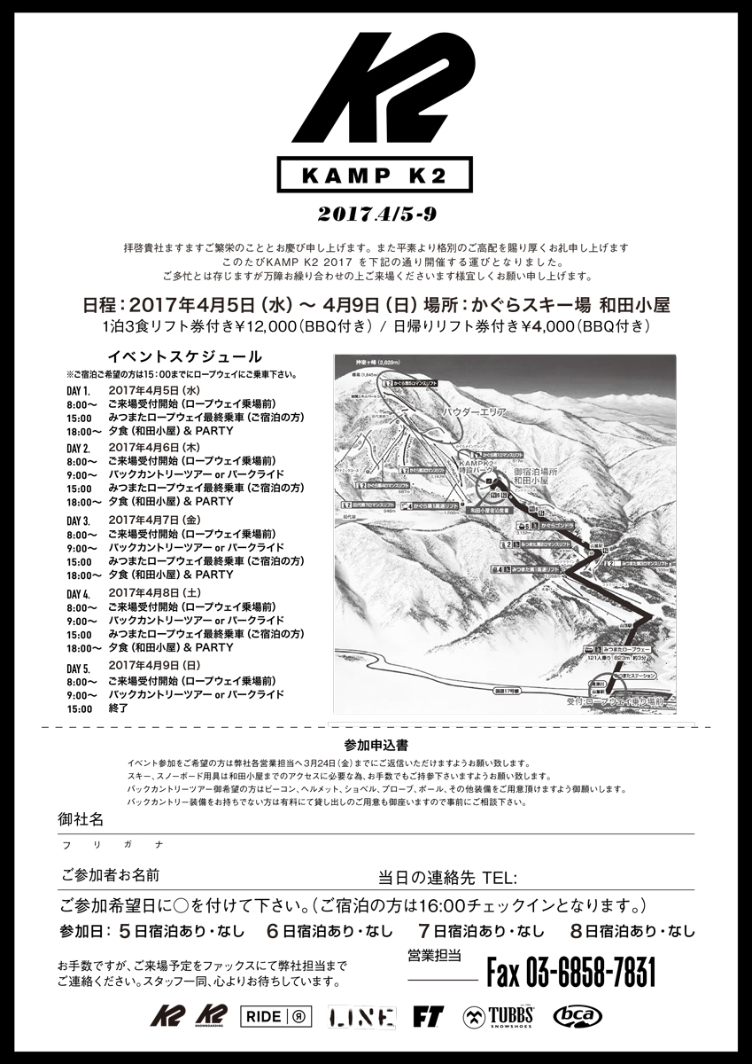 春の祭典です!ことしもかぐらにて、KAMP K2が開催されます。一般ユーザーの方も参加できるイベントですので、ぜひチェックしてみてください。 JUGEMテーマ :スノーボード