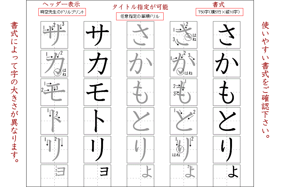 下例のようなオリジナルな自分だけのドリルを簡単に作成することができます。 ◇ユーザが入力した文字列が、そのままドリルになります。 ◆ひらがな、カタカナ、漢字に対応しています。 ◇全ての文字に筆順番号がつきます。 ◆なぞり書きの練習ができます。 ◇見写し書きの練習ができます。 ◆筆順番号がついているので、どのような文字にも挑戦できます。 ◇行単位で黒字、筆順字、なぞり字の指定ができます。 ◆複数の書式(縦字数×横字数)をご用意しています。 五十音の練習、名前の練習、美字の練習、難しい漢字の練習...