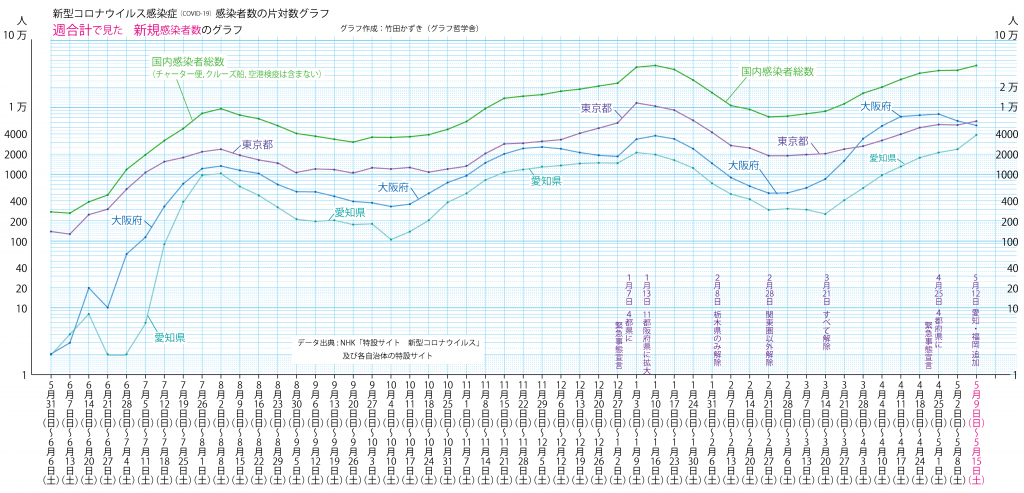 ここのところ,新型コロナウイルス感染症の日ごとの新規感染者数についてグラフにしていました。昨日のグラフはこちらです。 これは,「1日ごとの新規感染者については,1週間平均で見たほうがわかりやすい」と考えて描いていたグラフです。 しかし「増加率」を見るためには,このような背比べのグラフでは見えにくくなります。 それについては「漫画「〈かけ算の世界〉と対数グラフ」(またの名を「新・対数グラフ入門まんが」)」でまとめた通りです。増加"率"を見るためには,対数グラフを使うほう...