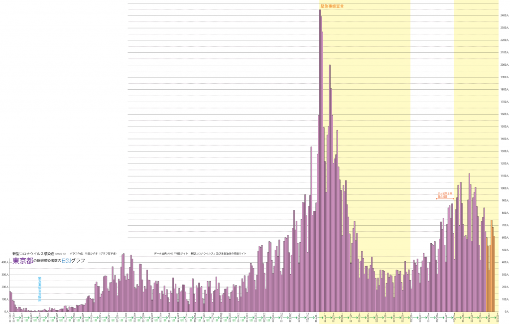 JUGEMテーマ:教育 以前のブログ(2020/7/25)の最新版(2021/5/28)です。 ※先週から同じ部分も多いですが,グラフは最新のものです。 ※かなり長いグラフになってしまったので,スマホなどで拡大して見てください。 日別新規感染者数のグラフを描きました。 東京都の日別新規感染者数のグラフは以下のようになります。(直近の1週間はオレンジ色にしています) ただ,この凸凹のグラフはわかりにくいです。 この様な数字は検査の曜日,祝日の有無などによって,検査や報告...