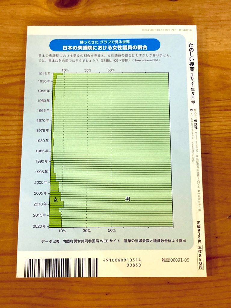 JUGEMテーマ:教育 先月に引き続き,月刊誌『たのしい授業』2021年5月号(仮説社)に掲載いただきました。 「日本の女性首長の数,各国の女性議員の割合の変遷(下)」です。 今月号は「日本と世界の女性議員の割合(1945年〜2020年)」を取り上げています。 「女性議員の割合」を扱ったグラフは珍しくありませんが, 今回,私は帯グラフにして「女性議員と男性議員の割合を一望できるグラフ」としました。 本文中には,米国,韓国,フランス,スウェーデンの...