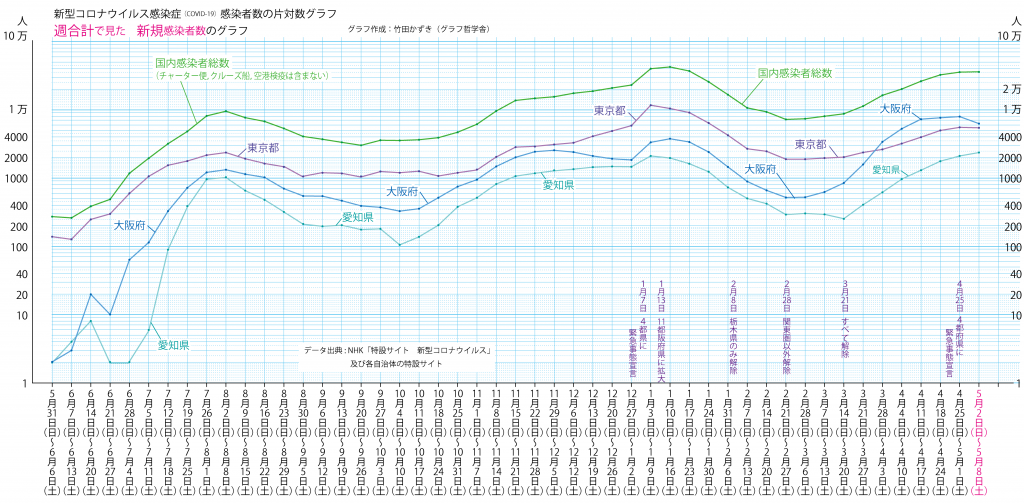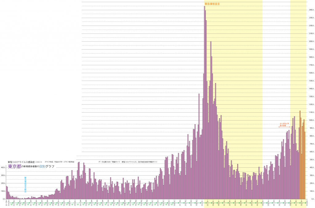 JUGEMテーマ:教育 以前のブログ(2020/7/25)の最新版(2021/5/14)です。 ※先週から同じ部分も多いですが,グラフは最新のものです。 ※かなり長いグラフになってしまったので,スマホなどで拡大して見てください。 日別新規感染者数のグラフを描きました。 東京都の日別新規感染者数のグラフは以下のようになります。(直近の1週間はオレンジ色にしています) ただ,この凸凹のグラフはわかりにくいです。 この様な数字は検査の曜日,祝日の有無などによって,検査や報告...
