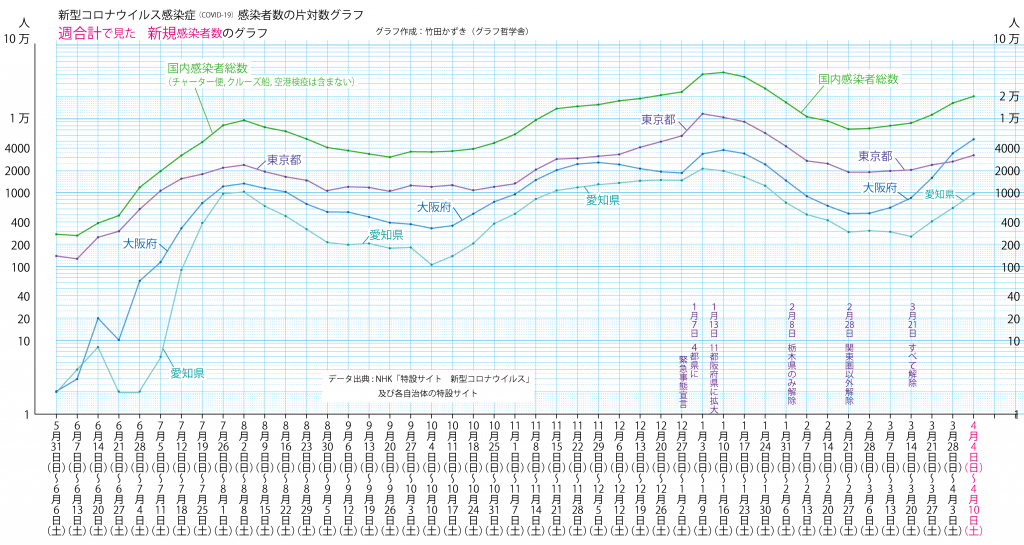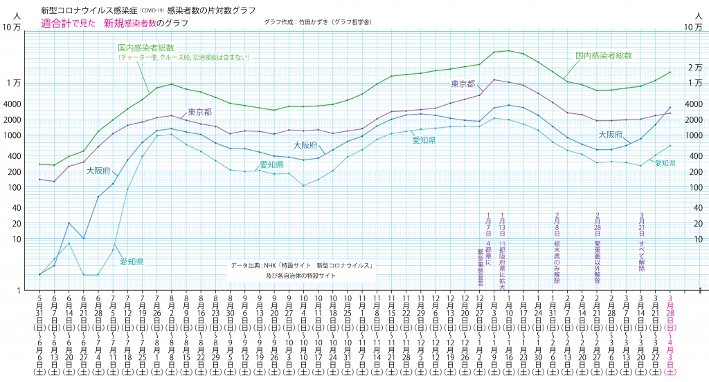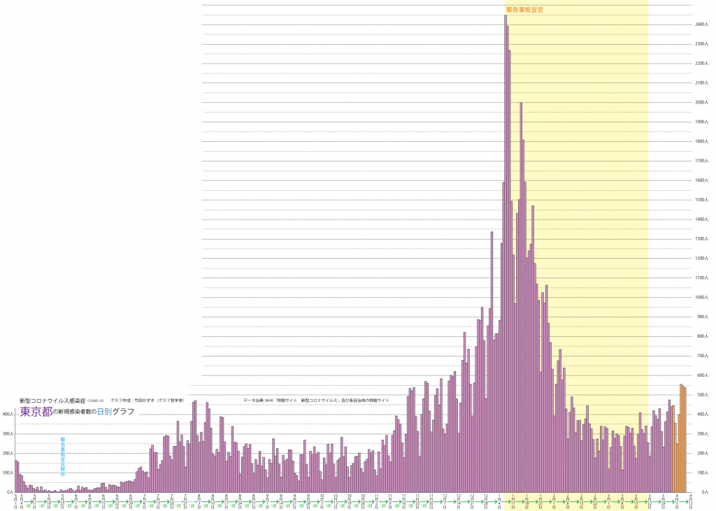 JUGEMテーマ:教育 以前のブログ(2020/7/25)の最新版(2021/4/9)です。 ※先週から同じ部分も多いですが,グラフは最新のものです。 ※かなり長いグラフになってしまったので,スマホなどで拡大して見てください。 日別新規感染者数のグラフを描きました。 東京都の日別新規感染者数のグラフは以下のようになります。(直近の1週間はオレンジ色にしています) ただ,この凸凹のグラフはわかりにくいです。 この様な数字は検査の曜日,祝日の有無などによって,検査や報告体制...