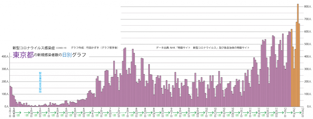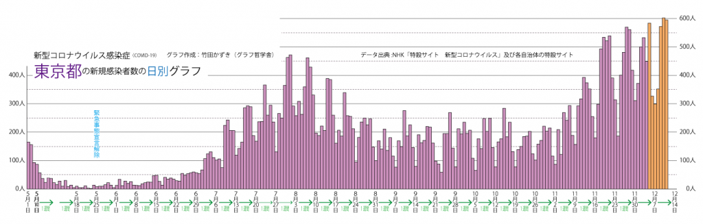 JUGEMテーマ:教育 以前のブログ(2020/7/25)の最新版(12/18)です。 ※先週から同じ部分も多いですが,グラフは最新のものです。 日別新規感染者数のグラフを描きました。 東京都の日別新規感染者数のグラフは以下のようになります。(直近の1週間はオレンジ色にしています) ただ,この凸凹のグラフはわかりにくいです。 この様な数字は検査の曜日,祝日の有無などによって,検査や報告体制は変わるため, 「新規感染者数の1週間の平均グラフ」を描いています。 (「その日の...