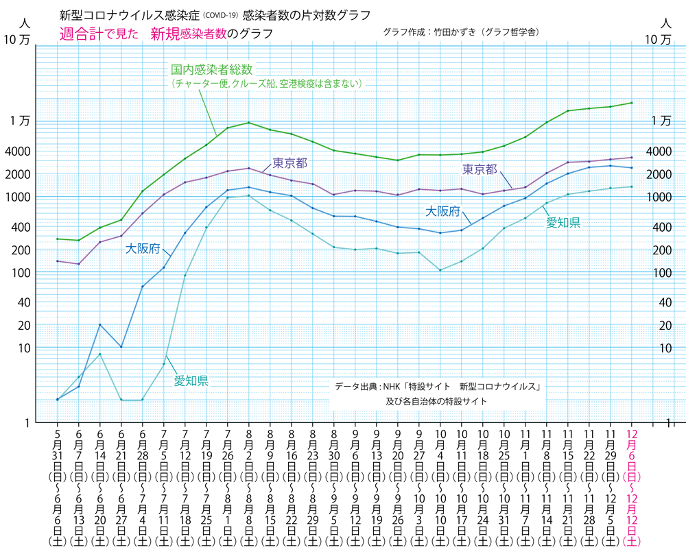 JUGEMテーマ:教育 以前のブログ(2020/7/25)の最新版(12/11)です。 ※先週から同じ部分も多いですが,グラフは最新のものです。 日別新規感染者数のグラフを描きました。 東京都の日別新規感染者数のグラフは以下のようになります。(直近の1週間はオレンジ色にしています) ただ,この凸凹のグラフはわかりにくいです。 この様な数字は検査の曜日,祝日の有無などによって,検査や報告体制は変わるため, 「新規感染者数の1週間の平均グラフ」を描いています。 (「そ...
