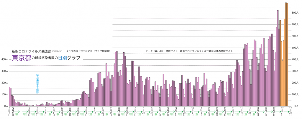 JUGEMテーマ:教育 以前のブログ(2020/7/25)の最新版(12/25)です。 ※先週から同じ部分も多いですが,グラフは最新のものです。 日別新規感染者数のグラフを描きました。 東京都の日別新規感染者数のグラフは以下のようになります。(直近の1週間はオレンジ色にしています) ただ,この凸凹のグラフはわかりにくいです。 この様な数字は検査の曜日,祝日の有無などによって,検査や報告体制は変わるため, 「新規感染者数の1週間の平均グラフ」を描いています。 (「その日の...