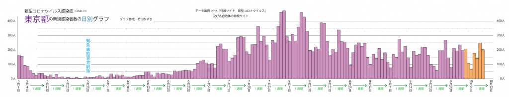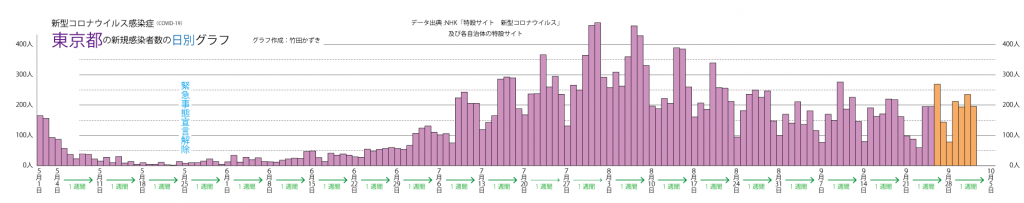 JUGEMテーマ:教育 以前のブログ(2020/7/25)の最新版(10/9最新版)です。 ※先週から同じ部分も多いですが,グラフは最新のものです。 ※他の研究(統計学の歴史)を本格的に再開したので,来週以降予告なく更新しなくなるかもしれません。 日別新規感染者数のグラフを描きました。 東京都の日別新規感染者数のグラフは以下のようになります。(直近の1週間はオレンジ色にしています) ただ,この凸凹のグラフはわかりにくいです。 この様な数字は検査の曜日,祝日の有無な...