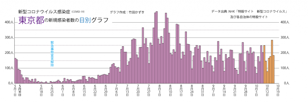 JUGEMテーマ:教育 以前のブログ(2020/7/25)の最新版(10/16最新版)です。 ※先週から同じ部分も多いですが,グラフは最新のものです。 ※他の研究(統計学の歴史)を本格的に再開したので,来週以降予告なく更新しなくなるかもしれません。 日別新規感染者数のグラフを描きました。 東京都の日別新規感染者数のグラフは以下のようになります。(直近の1週間はオレンジ色にしています) ※先週の段階であまりに横軸が長くなってしまったので,グラフの幅を半分にして,横軸を短く...