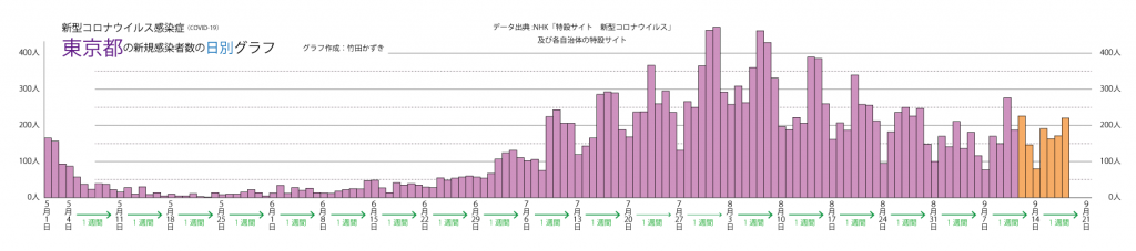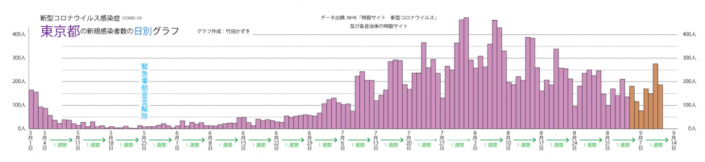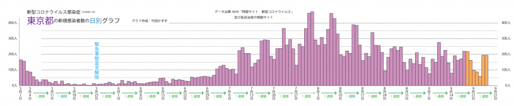 JUGEMテーマ:教育 以前のブログ(2020/7/25)の最新版(9/11最新版)です。 ※先週から同じ部分も多いですが,グラフは最新のものです。 ※他の研究(統計学の歴史)を本格的に再開したので,来週以降予告なく更新しなくなるかもしれません。 日別新規感染者数のグラフを描きました。 連日,東京都の新規感染者数の報道があります。 日によって多かったり少なかったりします。 東京都の日別新規感染者数のグラフは以下のようになります。(直近の1週間はオレンジ色にし...