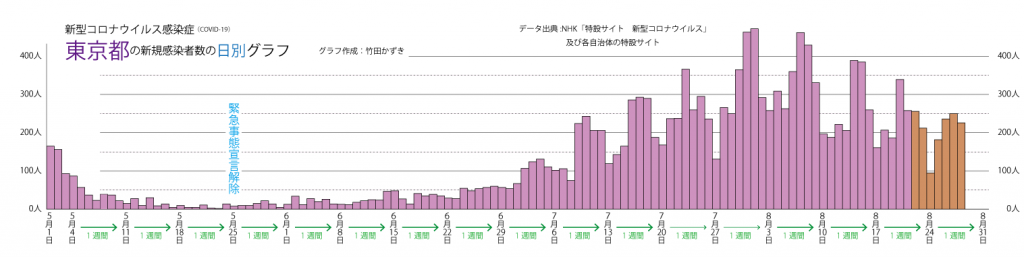 JUGEMテーマ:教育 以前のブログ(2020/7/25)の最新版(9/4最新版)です。 ※先週から同じ部分も多いですが,グラフは最新のものです。 日別新規感染者数のグラフを描きました。 連日,東京都の新規感染者数の報道があります。 日によって多かったり少なかったりします。 東京都の日別新規感染者数のグラフは以下のようになります。(直近の1週間はオレンジ色にしています) ただ,この凸凹のグラフはわかりにくいです。 この様な数字は検査の曜日,祝日の有無な...