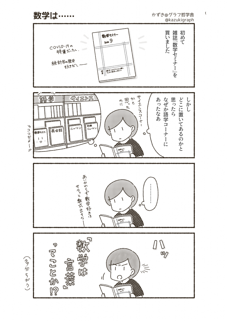 JUGEMテーマ:教育 『数学セミナー』2020年9月号買いました。 「数学は言葉」ということは,ピンとくる人にはツーカーですが,ピンとこない人に説明できるほど私もまとまっていない……と思いつつ……な漫画です。(いつかちゃんと話せるようになりたい)