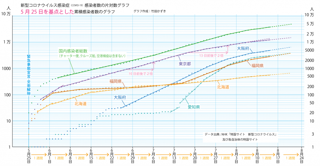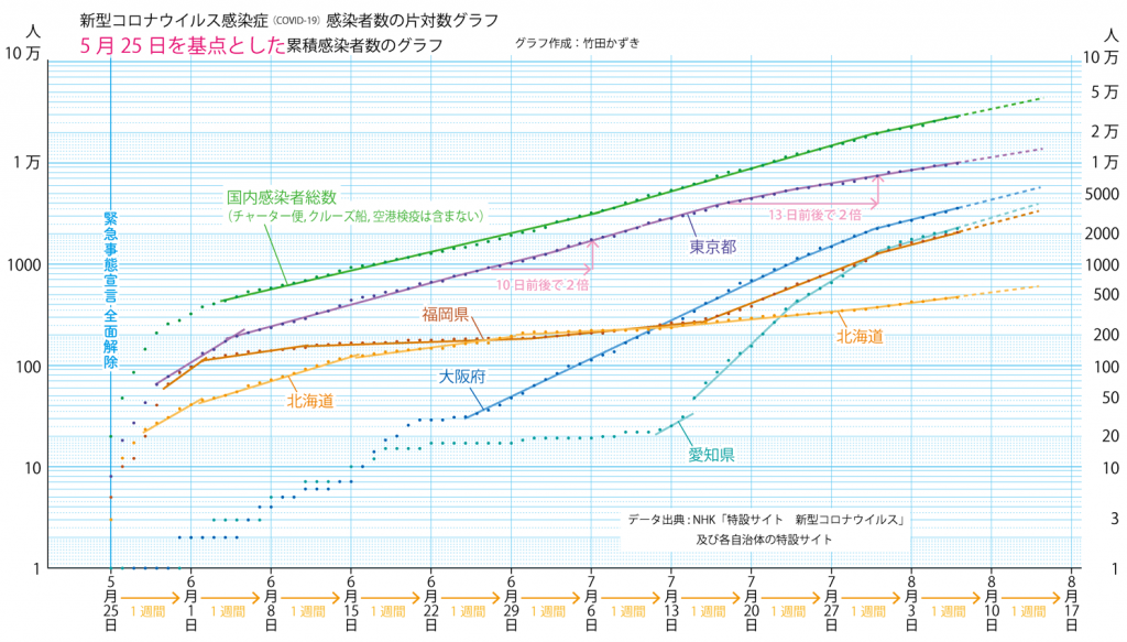 JUGEMテーマ:教育 昨日は日別グラフを描いたので,今度は片対数グラフです。 以前のブログでも,「どのような片対数グラフを描くのがよいか」ということは書いているのですが,紛らわしいので今回も改めて書きます。 (以前のブログと同じことを書いているので,一度読んだ方は飛ばしてください) ※ ※ ※ 「昨今の感染状況について,片対数グラフを描く」と言っても,どのように描けばいいのか----私はそんなことが気になっていました。 昨日は日別の新規感染者グラフ...