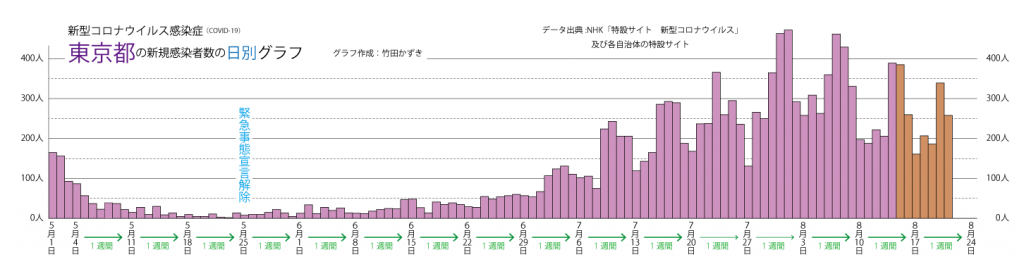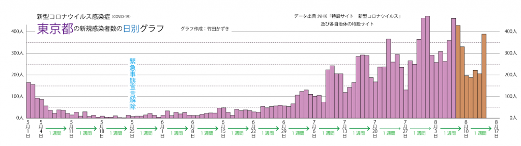 JUGEMテーマ:教育 先週(2020/8/9)のブログ(http://blog.graph.moo.jp/?eid=49)の最新版です。 日別新規感染者数のグラフを描きました。 連日,東京都の新規感染者数の報道があります。 日によって多かったり少なかったりします。 東京都の日別新規感染者数のグラフは以下の様になります。(直近の1週間はオレンジ色にしています) ただ,この凸凹のグラフはわかりにくいです。 この様な数字は検査の曜日,祝日の有無などによって,検査や報告体制は変わるため, 「新規...