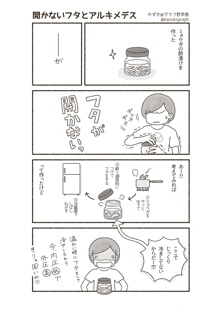 JUGEMテーマ:教育 この感動を共有したい! というわけで無事開きました。 生活の中のことを科学的な目で見るのが好きです。 そしてその困難が科学的に解決すると,さらにたのしくなります。 温かいまま冷やすと,気圧の差によって超絶固い状態になるという話はまた別の機会に……(あるかわからないですが)
