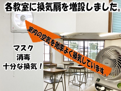 JUGEMテーマ:教育 暑くなり窓を開けての換気ではクーラー効かないので 夏季休暇の間に各部屋に換気扇を増設しました。 夏休み明けもマスク着用と手消毒はしっかり行ってくれています✨✨ 私たちも、少しでもよりよい環境で学習できるように頑張ります✌