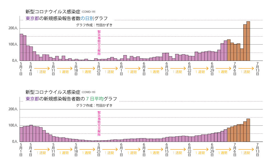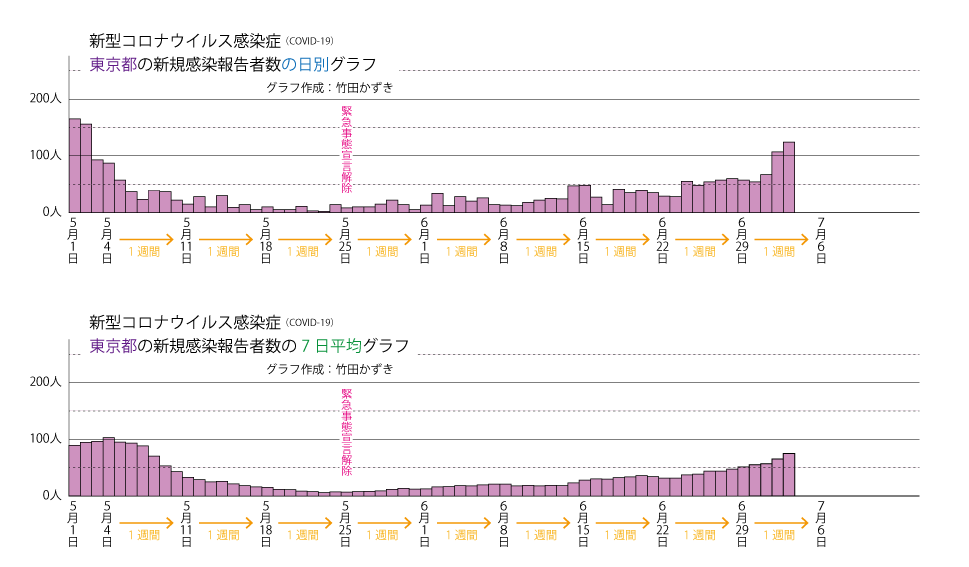 JUGEMテーマ:教育 先週(http://blog.graph.moo.jp/?day=20200705)に続いて,東京都の日別感染者数と,対数グラフについて描いています。 ●7/4〜7/10の東京都の日別新規感染報告者数と,その7日平均グラフ 7/4〜7/10の東京都の日別新規感染報告者数と,その7日平均グラフを描くと以下のようになります。 (7日平均とは「その日のグラフについて近辺の7日間を合計し7で割ったもの」です。日別の場合,検査体制によって日ごとに差が出ることがあるため,その差を...