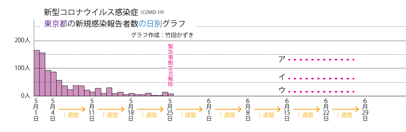 JUGEMテーマ:教育 5月後半になって,新型コロナウイルス感染症の国内感染者数の数が落ち着いたことから,しばらくブログを更新していませんでした。 (他のことに忙しかったのもありますが) しかし,6月下旬になり,東京都の新規感染報告者数が少し増えたように感じました。 そのため,今一度グラフを描いてみたくなりました。 今回はひとまず「1日の新規感染報告者」の日毎のグラフです。 日本では5月25日に緊急事態宣言は解除となりま...