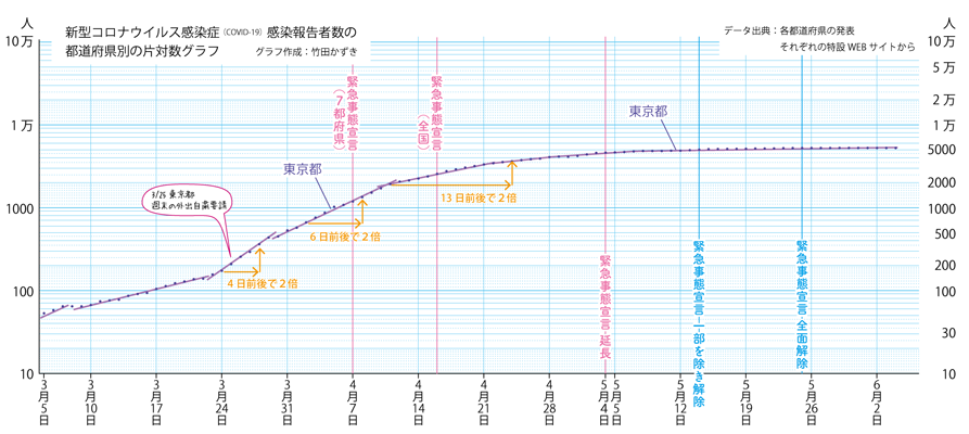JUGEMテーマ:教育 昨日,新型コロナウイルス 東京都の新規感染報告者数,7日平均で見てみると(5/1〜6/25) を描きました。 その後,増加率が気になったので片対数グラフも描いてみたくなりました。 (片対数グラフについてはこの漫画で解説しています) 以前描いた片対数グラフから東京都だけを抜き出すと,次のようになります。 東京都の感染報告者の増加率は,3月後半には「4日前後で2倍」,4月前半には「6日前後で2倍」と高い増加率で...