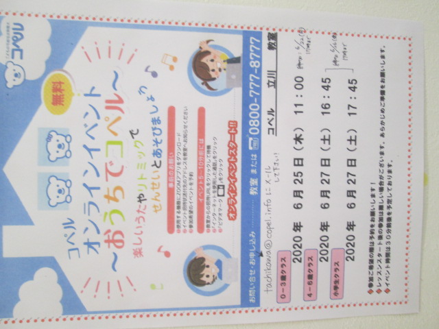 JUGEMテーマ:幼児教育 JUGEMテーマ:教育 こんにちは! 立川教室のおぎわらです(*^^*) 6月のレッスンスケジュールはこちら! 今日はおうちでコペルのレッスンを受けることができるイベントをご紹介♪ ☆★通室者限定イベント★☆ コペル オンラインイベント 〜おうちでコペル〜 0〜3歳さんクラス 6月25日(木)11時〜 4〜6歳さんクラス 6月27日(土)16時45分〜 小学生さんクラス 6月27日(土)17時45分〜 参加費:無料 用意するもの:紙とペン(く...