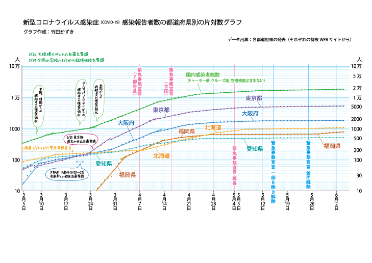 JUGEMテーマ:教育 定例観測としていましたが,3週間ほどできておりませんでした。 久々に2020/6/4までの対数グラフを描きました。 ※このグラフは片対数グラフです。対数グラフについてはこちらをご覧ください。 緊急事態宣言が段階的に解除になり,その後はだいたい増加傾向はない(=グラフの傾きが水平)ように見えます。 ただ,福岡県だけはやや増加傾向が見えだしました。 しかし3月や4月前半のような増加傾向ではありません。 このままおさまると良いのですが&h...