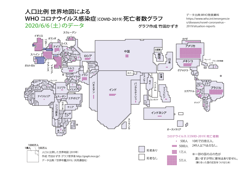 人口に比例した世界地図に〈国別の新型コロナウイルス感染症の死者数〉を描いたグラフを更新しました。 2020/6/6は以下のようなグラフです。 以前に比べ,南米アメリカの死亡者数が増えてきました。 まだ数は少ないですが,アフリカ大陸も少し増え出しています。 それぞれの静止画を置いておきます。(2週間ごと) 3/28(土) ↓ 2週間後 ↓ 4/11(土) ↓ 2週間後 ↓ 4/25(土) ↓ 2週間...