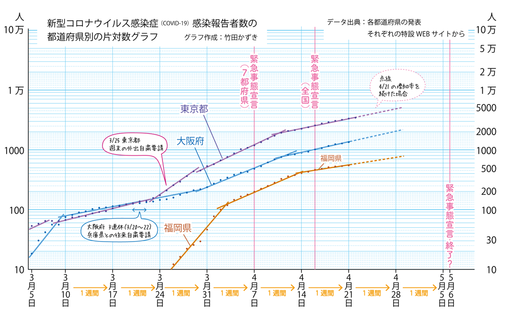 JUGEMテーマ:教育 2020/4/7に緊急事態宣言が発令され,4/28で3週間経ちました。 定点観測の意味をこめてグラフを描き続けています。 ※これまでも,都道府県別に感染報告者の片対数グラフを描いています。 3/30(東京都と愛知県について),3/31(北海道について),4/6(再び東京都について),4/7(東京都,愛知県,北海道,大阪府,福岡県,福井県について),4/15(緊急事態宣言1週間後),4/23(緊急事態宣言2週間後),4/28(緊急事態宣言3週間後) ※片対数グラフについては,こちらの...