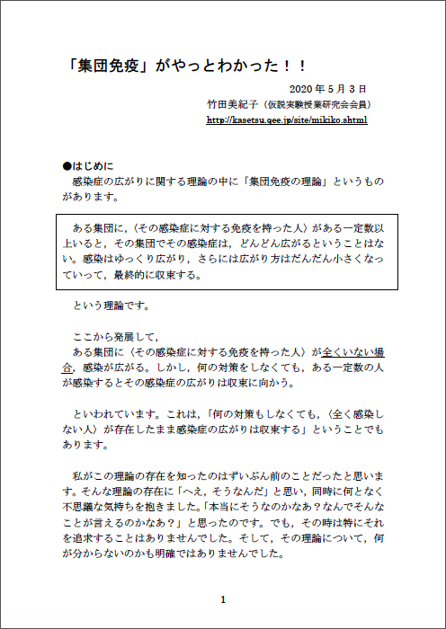 JUGEMテーマ:教育 母(竹田美紀子)が「集団免疫と免疫率の話」を書きました。 私はこれを読んで「なるほど,集団免疫についてわかった〜!」と思いました。 「集団免疫って何?」とか 「免疫率の仕組みがわからない」とか 「感染の再生産数ってどういうこと?」とか, このレポートがわかりやすいと思います。よければこちらからご覧ください。 (少しわかりにくい箇所を指摘いただいたため,5/5 午前1時に変更しました) 母のWEBサイトはこちらです。 ...