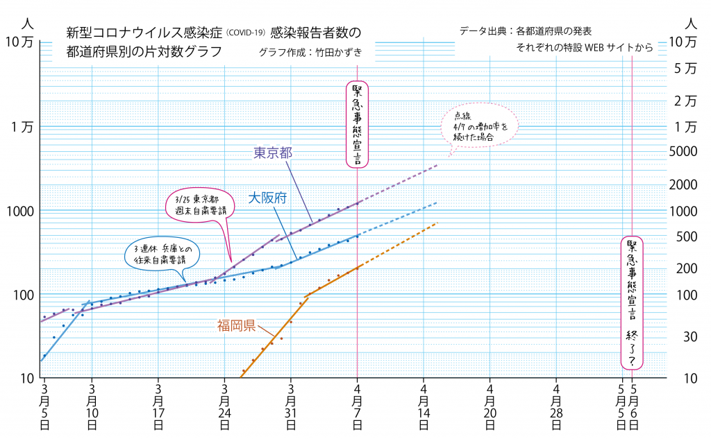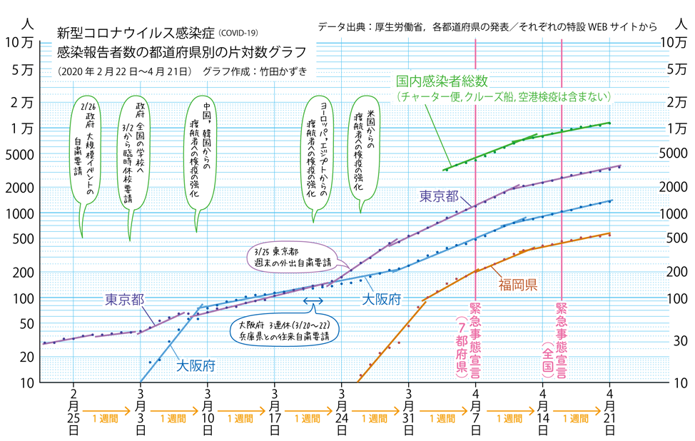 JUGEMテーマ:教育 2020/4/7に緊急事態宣言が発令され,4/21で2週間経ちました。 〈人の接触機会を減らすことで感染の拡大を抑え込む〉という対策が行われていますが,その成果が現れるのは2週間後といわれています。成果が出るのはこれからと思いましたが,定点観測の意味もこめてグラフを描きました。 ※これまでも,都道府県別に感染報告者の片対数グラフを描いています。 3/30(東京都と愛知県について),3/31(北海道について),4/6(再び東京都について),4/7(東京都,愛知県,北海道,...