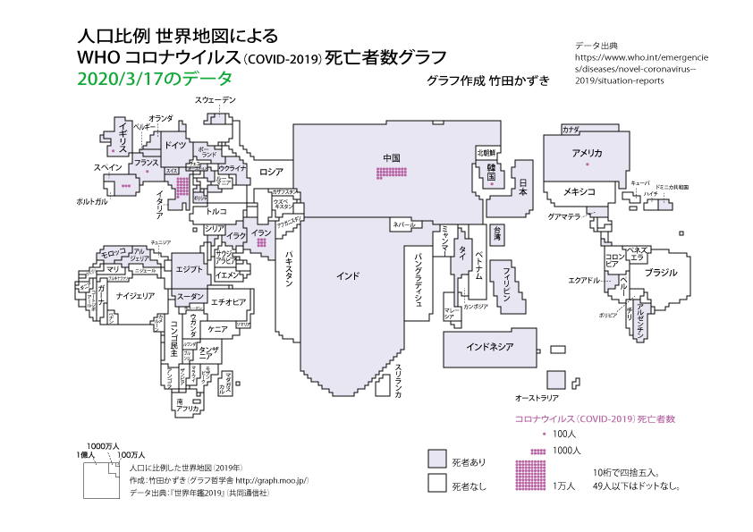 JUGEMテーマ:教育 新型コロナウイルス感染症(COVID-2019)の死亡者(人口に比例した世界地図)」のグラフを描きました。 この感染症は爆発的に死亡者が増えていっている国があるので,その後のグラフも描きました。 前回は「2020/3/17」と「2020/3/27」の2つのグラフ(人口に比例した世界地図に死亡者数を描いたもの)でしたが,今回は「2020/3/17」から5日ずつのグラフを描いてみました。 ※前回数箇所ミスをしていたので修正しました。 ●2020/3/17 ↓5日後 ●2020/3/22 ...