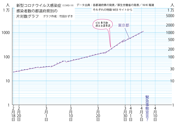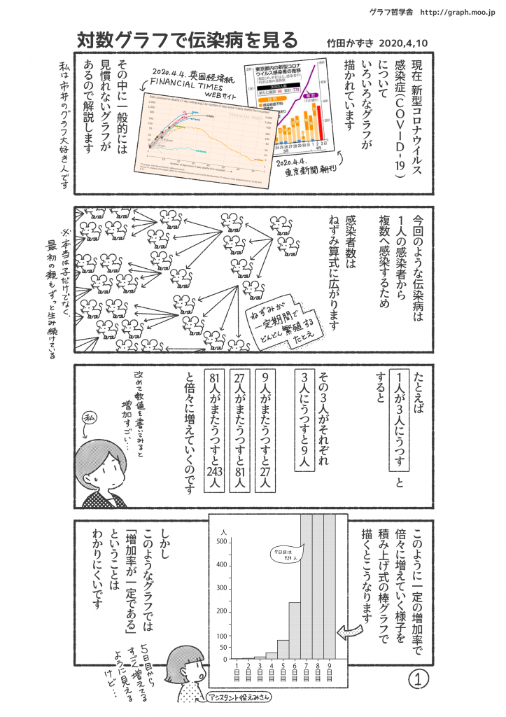 JUGEMテーマ:教育 新型コロナウイルス感染症について,片対数グラフを見かけたり私自身描いているのですが, 「対数グラフとはなんぞや」ということを伝えたくて漫画を描きました。 「対数グラフで伝染病を見る」(全12ページ) サイトにpdfファイルでアップしたのでまとめて読みたい人はこちらにどうぞ http://graph.moo.jp/comic.html#up202004100200410 ※2020/4/11 友人に助言を受けました。 「対数グラフに興味がない人でも,漫画後半の"現在の東京都,大阪府,福...