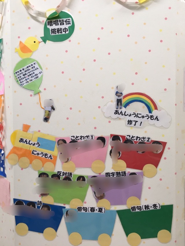 JUGEMテーマ:幼児教育 JUGEMテーマ:教育 こんにちは! 立川教室のおぎわらです(*^^*) 4月のレッスンスケジュールはこちら! 教室がお休みの間、教室の掲示物をちょっと変えました! あんしょうを1人でも行っているクラスは、 周りの子もつられて一緒に行ってくれている子が多いのですが、 あんしょうが盛んではないクラスは全く発表がないので、 こうやってクラスが違ってもお互いに刺激があればと思い作成しました♪  ...