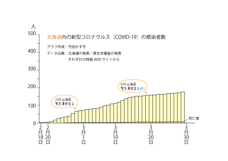 JUGEMテーマ:教育 ※死亡者数のグラフを間違えていたので修正しました。(4/6 22:00) 昨日,東京都と愛知県の新型コロナウイルス感染者数グラフを描きました。 自分で描いてみて「ようやく感染者数が増加するイメージが持てた」と思ったのですが,その一方で「未来を見通せるとは言い難いなあ」とも思ってしまいました。 そこで,さらに「北海道の新型コロナウイルス感染者数グラフ」も描いてみることにしました。 北海道では2020年2月28日に知事が「緊急事態宣言」を出し...