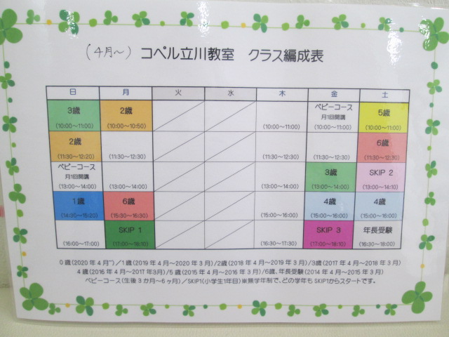 JUGEMテーマ:幼児教育 JUGEMテーマ:教育 こんにちは! 立川教室のおぎわらです(*^^*) 本日で3月のレッスンが終了しました! 4月からは全員1つ上の学年に上がったクラスになります! お間違えの無いようよろしくお願いします♪ 4月のベビーコースは4月10日(金)10時〜11時と 4月12日(日)13時〜14時です♪ 対象年齢は、生後3か月から6か月の赤ちゃん! 詳細はこちらから! 4月レッスンスケジュール↓ ...