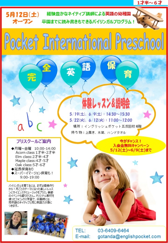 JUGEMテーマ:児童英語 バイリンガルを育てるには、まずは環境作りから! 月ごとのテーマに沿った楽しいレッスンにサイエンスや ミュージックをプラス。季節のイベントも盛りだくさん。 オリジナル教材を使ったフォニックス学習で、 卒園時には、同年齢のネイティブと同じ英語力が身に つきます。 【体験レッスン&説明会】 5/19(土), 6/9(土):14:30〜15:30 5/22(火), 6/12(火):11:00〜12:00 場所:イングリッシュポケット五反田校 6階 持ち物:上履き、水筒、ハンド...