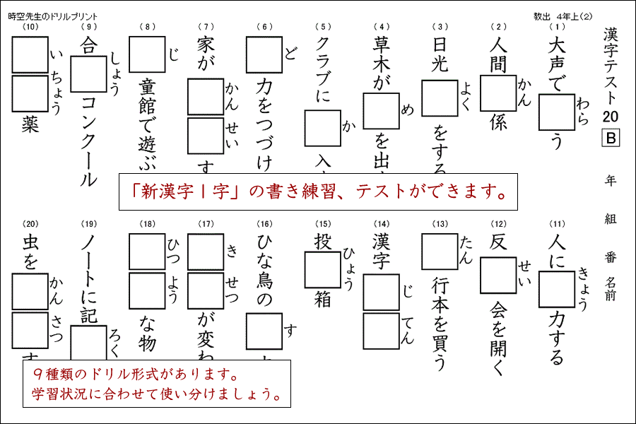 次は漢字テスト20問です。 新漢字1の書き練習、テストに使えます。 時空先生のドリルプリント http://jikuukan.ac/Index.html 時空先生のドリルプリント JUGEMテーマ:おすすめ教材