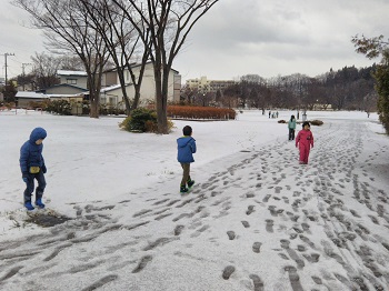 JUGEMテーマ:小学生ライフ(・ω・*)ノ 昨日は久しぶりに外遊びが出来ました。あま雪が 少し降ってはいましたが、子ども達は元気に出かけました。 ここは公園の中心へのアプローチの部分。道路から比べると かなり広くなり、子ども達の遊び心に一気に火が付く場所です。 先日作った雪玉がまだありました。かなり汚れているのですが お構いなしに、触って遊びます。 足跡でサークルを作ると、おもしろい絵になりました。 もう少し雪がふると、ここからソリで滑ってあ...
