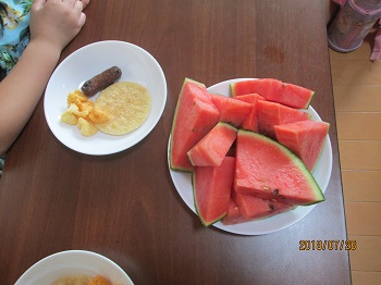 JUGEMテーマ:小学生ライフ(・ω・*)ノ 今日のおやつは初物、すいかでした。頂きものです。 おいしかったです。甘さばっちり。暑いときは音をだして すすって食べるとさらにおいしいとか。 車の外気温はずっと37℃。体温越えでした。これでは 外遊びは危険。「行きたい」という声も上がりましたが、 無理でした。 室内でも活動は忙しい日となりました。午前中は大きな 工作が3つ。そして、午後からは明日の合宿の結団式。 そして漢字の学習...