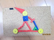 JUGEMテーマ:小学生ライフ(・ω・*)ノ 新しいおもちゃ、大工仕事。色とりどりの木片に 金づちで釘を打ち付け、コルクの台紙に作品を 作ります。にじっこのマイブームです。