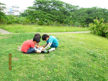 JUGEMテーマ:小学生ライフ(・ω・*)ノ 朝から暑くて大変でしたが、きっと30℃超えているな と思ってましたが、28℃に終わったようです。まもなくの30℃超えが 恐ろしく思いました。 そんな中子ども達は、元気に帰ってきました。背中にはランドセル 首にはしっかり水筒をつるして、部屋に入ったと同時に、グイグイ。 飲みながら、お話をしながら、座ってしばらく他校のお友達を待ちました、 そしてみんな揃ったところで、近隣公園に出かけました。 人出もすくなく、...