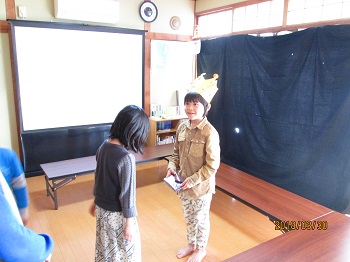 JUGEMテーマ:小学生ライフ(・ω・*)ノ にじっこの子ども達、今日は忙しい一日でした。 午前中には、新しい一年生の為にロッカーを整理整頓。 部屋の障子の穴もきれいに修繕。そしてネームシールの 貼り付けと頑張ってくれました。 お昼のあとは、各自勉強を頑張り、そしてお誕生会を 決行。3年生の男の子一人がお祝いされました。そして 恒例の映写会。タイトルは「いとしのムーコ」。 みんな大笑いしながら見ていました。 プレゼントをいただいて、にっこり。 い...