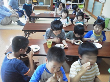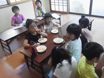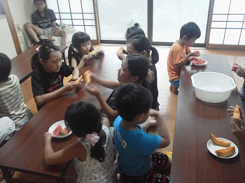 JUGEMテーマ:小学生ライフ(・ω・*)ノ 今朝の雷雨にはびっくりしました。いきなりザーッとドドーン。 天気予報では一日中雨でしたので、覚悟はしていましたが、 それにしてもでした。 今日の行事予定は「スイカ割り」でしたが、 やはりサンサンと輝く太陽の下が一番。子ども達には 気の毒でしたが、延期しました。でも、食するのには何も 問題ないことですので、おやつにいただきました。 差し入れのあったメロンと共に。 「おいしい、おいしい」といただきました。 ...