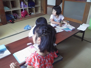 JUGEMテーマ:小学生ライフ(・ω・*)ノ 意外に雨の少ない一日でした。おかげで 子ども達もクサクサせず、元気に過ごしました。 そのせいか、写真もいっぱい撮れましたので、 ご覧ください。 最初は、いつものおやつ風景から。 今日の勉強は「音読」からだそうです。 なかなか上手ですよ。 だまっていても自分から勉強開始です。 火曜日は習字の日。1年生から5年生まで習っています。 先生がわざわざ出張で指導して...