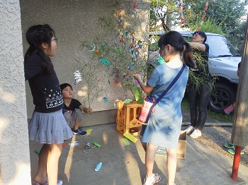 JUGEMテーマ:小学生ライフ(・ω・*)ノ 今日は七夕。暑い一日でした。 にじっこでも少しだけ飾りつけをして 短冊結びの笹を持って帰っていただきました。 玄関先に飾りつけました。 飾りつけを身に着けて、願い事をしました。 お天気がいいので、近隣公園に。広々として気持ちいいです。 ブランコはまだかいな。待ち遠しいです。 にじっこの庭先にあるミニ菜園から、大きなきゅうりが 採れました。みずみずしくおいしかったです。 近隣公園の片隅に咲...