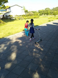 JUGEMテーマ:小学生ライフ(・ω・*)ノ 連日快晴の広面。勉強とおやつを終え、すぐに公園へ。 公園を楽しんでいる人がいっぱいです。中学生たち、主婦たち、 そしてお年寄りたち。年代はさまざまですが、どれも公園に お似合いですね。 にじっこたちも負けずに遊びました。今日はキックボードと 自転車を搬入。広い公園を何周も乗りました。 お迎え時間が近くなると、すぐ近くの遊園地へ 毎日引越です。