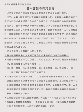JUGEMテーマ:クラス作り *〜*〜*〜*〜*〜*〜*〜*〜*〜*〜*〜*〜*〜*〜* *〜*〜*〜*〜*〜*〜*〜*〜*〜*〜*〜*〜*〜*〜* 2学期の個人面談について1 *〜*〜*〜*〜*〜*〜*〜*〜*〜*〜*〜*〜*〜*〜* ◆個人面談始まります! ◎期間 11月16日(水)〜11月22日(火) ◎目的 ・1〜2学期の成長や課題など 子どもを取り巻く 様々な事柄について 保護者と担任が ...